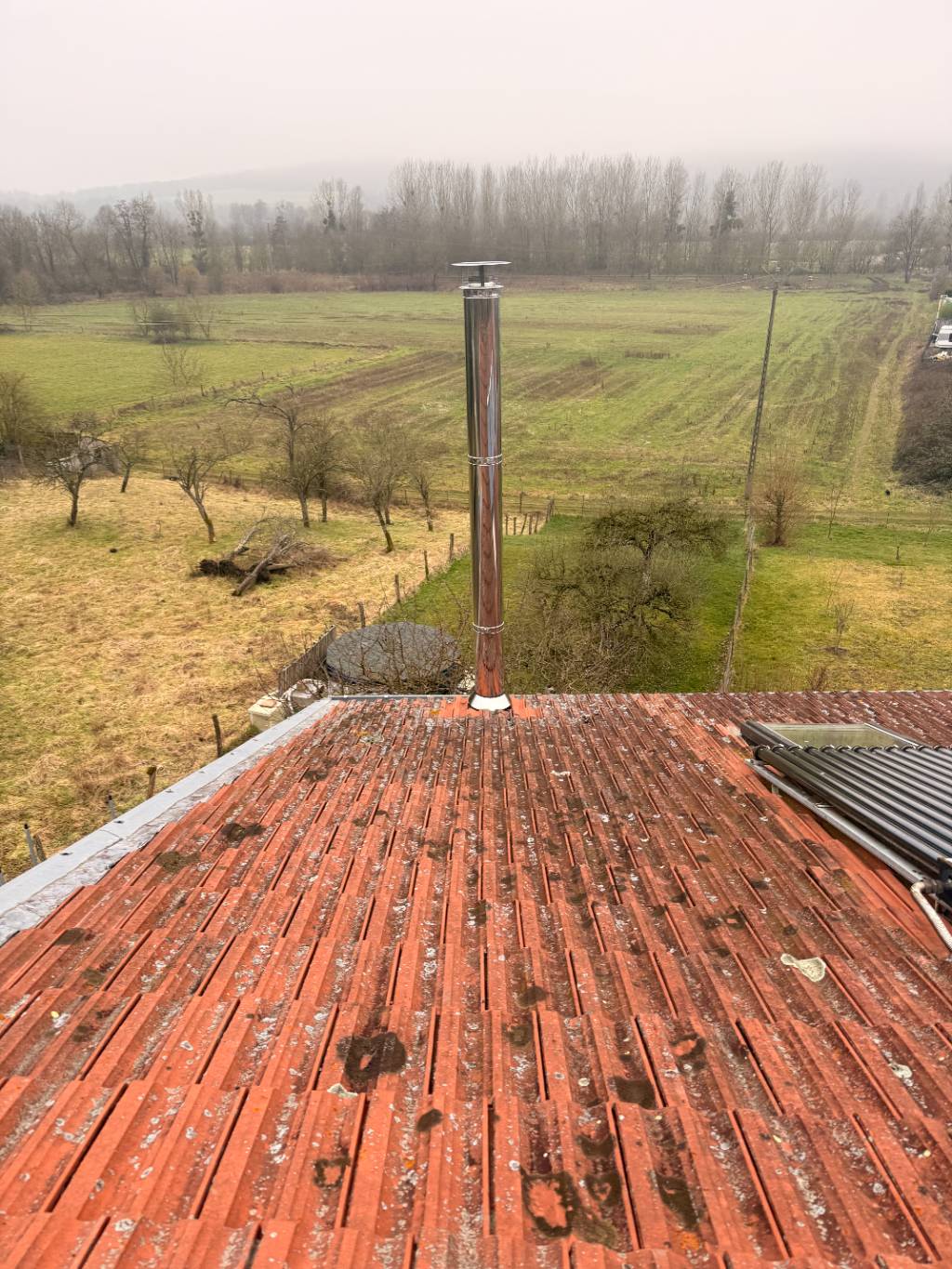 Pour la fumisterie, nous avons proposé la marque POUJOULAT et procédé au remplacement de son conduit extérieur avec la gamme THERMINOX TI 150 avec une rehausse après la traversée de toiture, afin de respecter les distances de sécurité requises pour l’évacuation des fumées selon la réglementation en vigueur de la zone 1 et l'espacement avec le vélux du client.